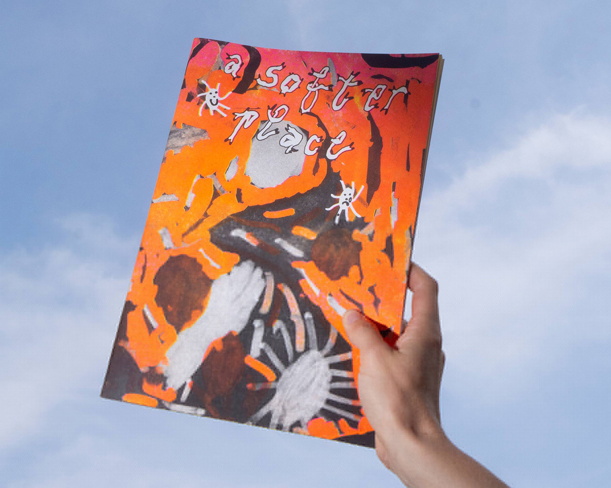 A SOFTER PLACE est le premier chapitre d’une histoire qui ne finira probablement jamais, un peu comme une rivière. Une rivière dans laquelle tu mets du temps à entrer parce qu'elle est trop froide, et quand tu en sors tu n’arrives plus à te réchauffer, et le vent n'a pas envie de t'aider. C’est aussi ma première bande dessinée, réalisée avec des larmes d’autres animaux et beaucoup d’amour.