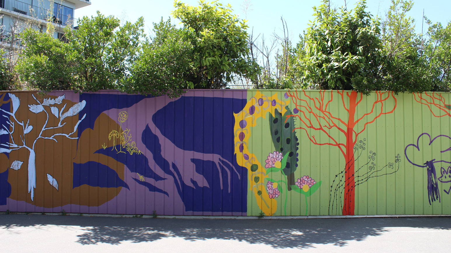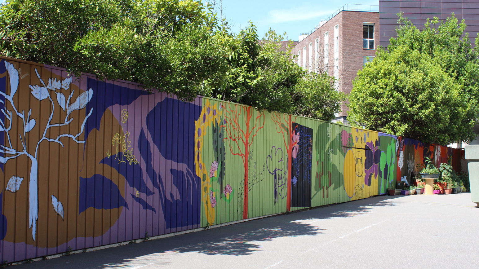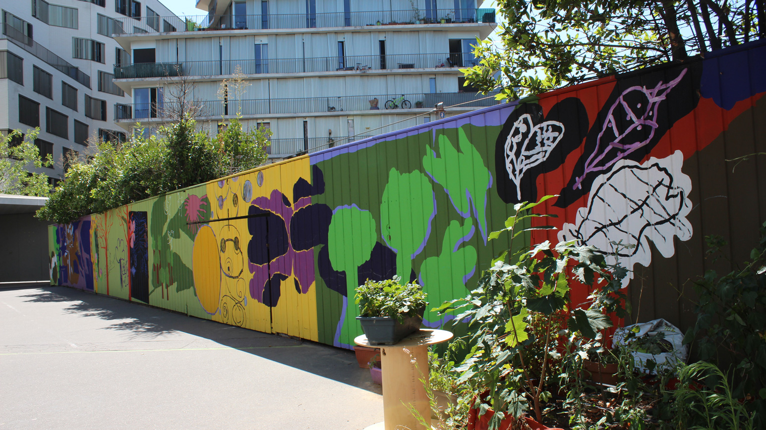 Oeuvre murale imaginée avec les enfants de l’accueil de loisirs de l’École des Grands Moulins et habitée des contributions d’Ahmed, Rawassi, Rimass, Lou, Jeanne, Ayoub, Missy, Alix, Alyssa, Anahke, Fanta et Neyla.