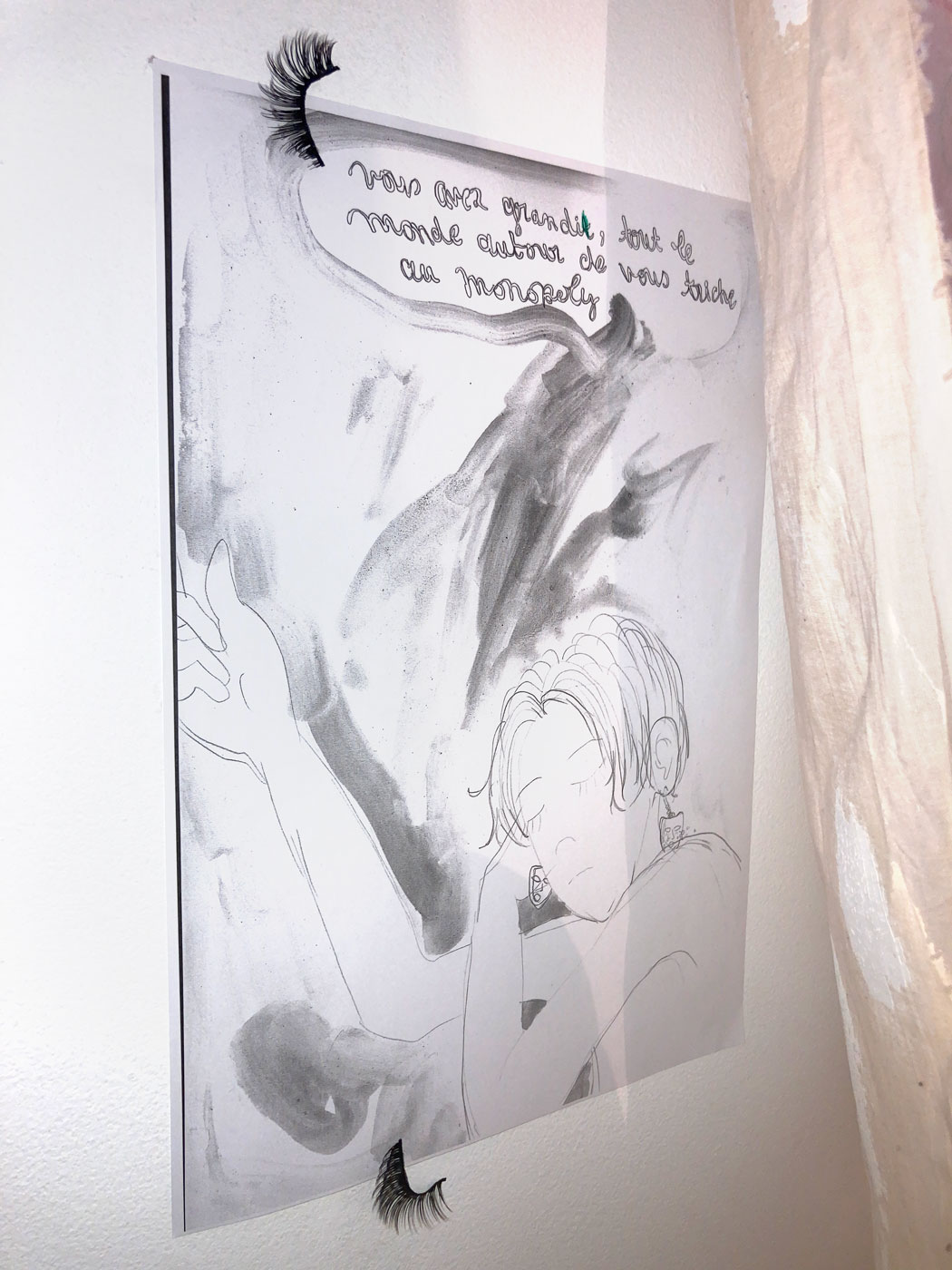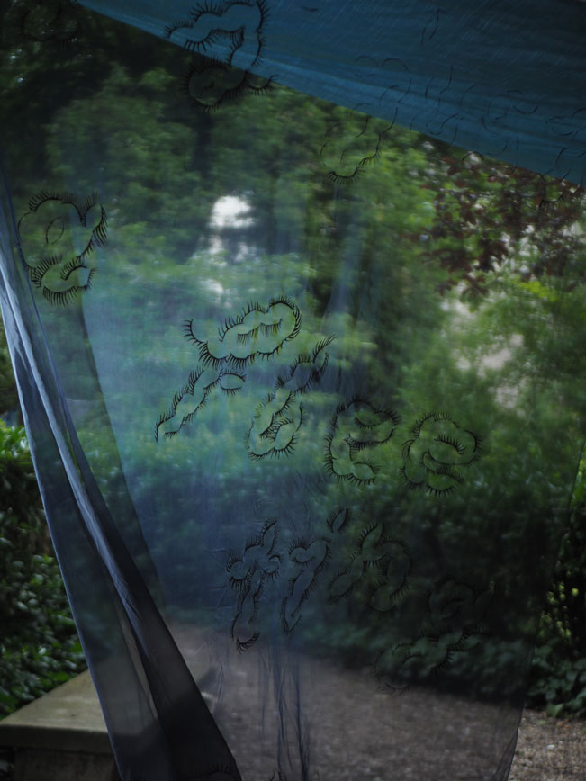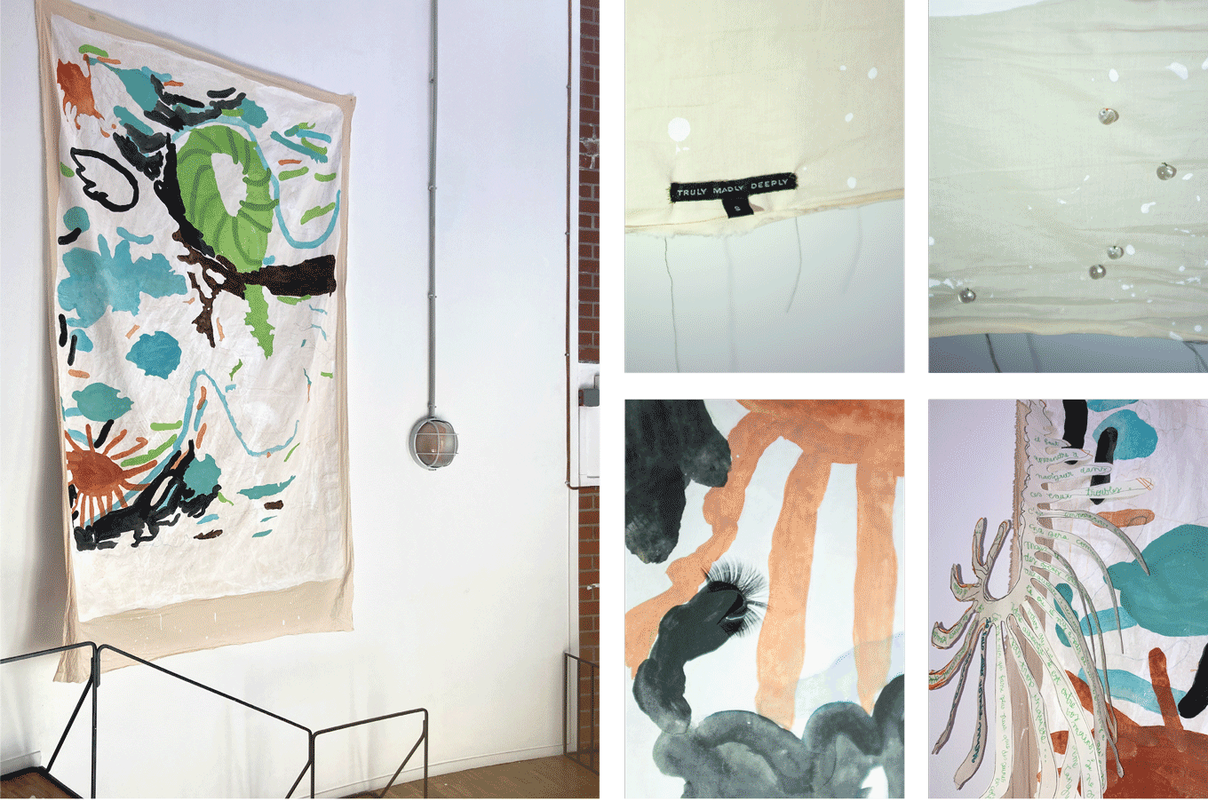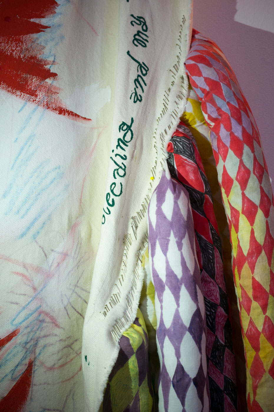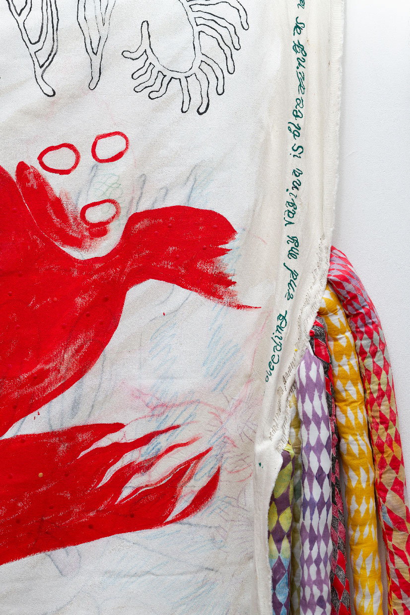 220 x 145 cm, acrylique sur tissu en coton, perles *larmes*, étiquette de t-shirt, poème sur un patron d’antenne, faux–cils