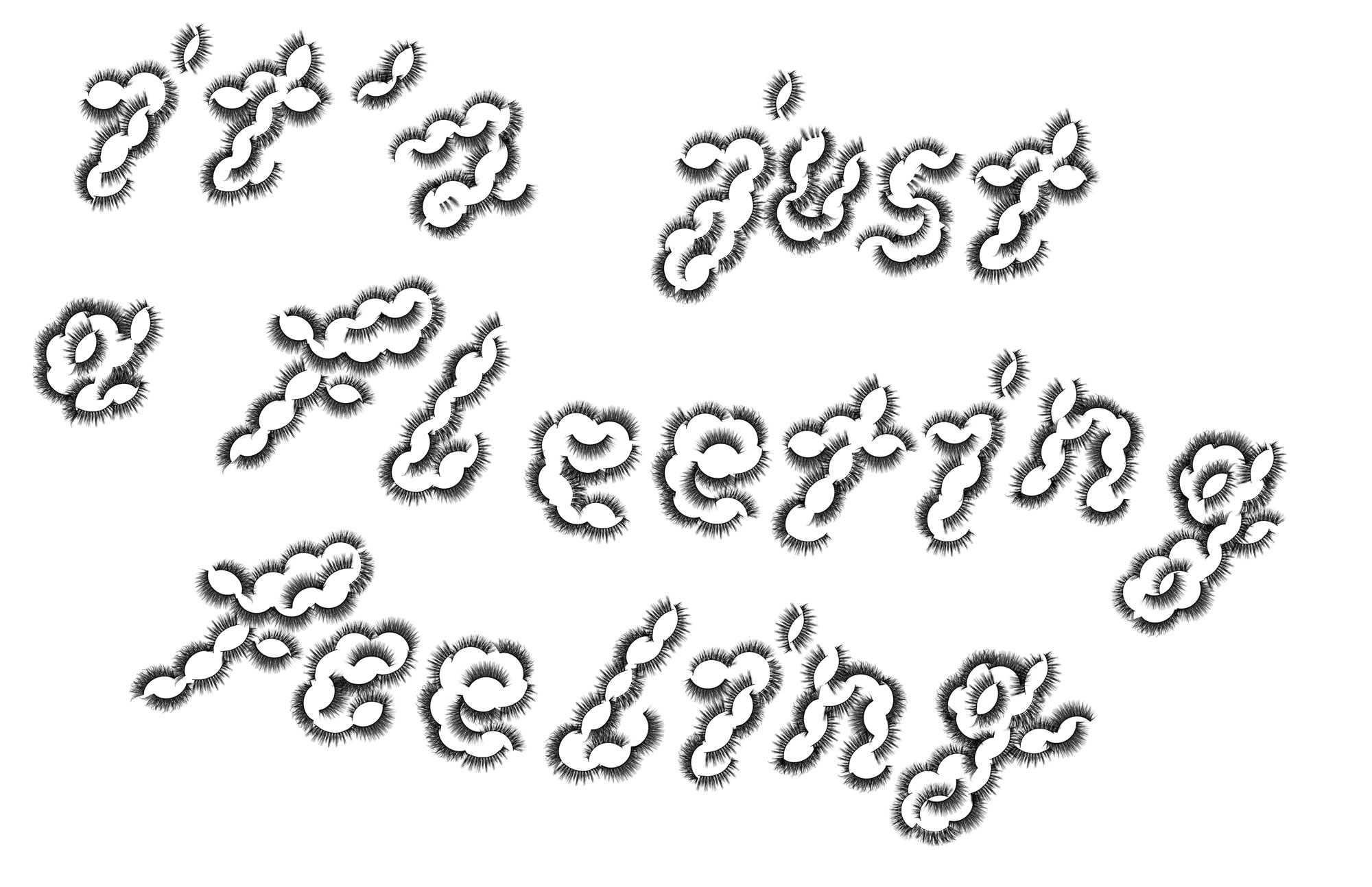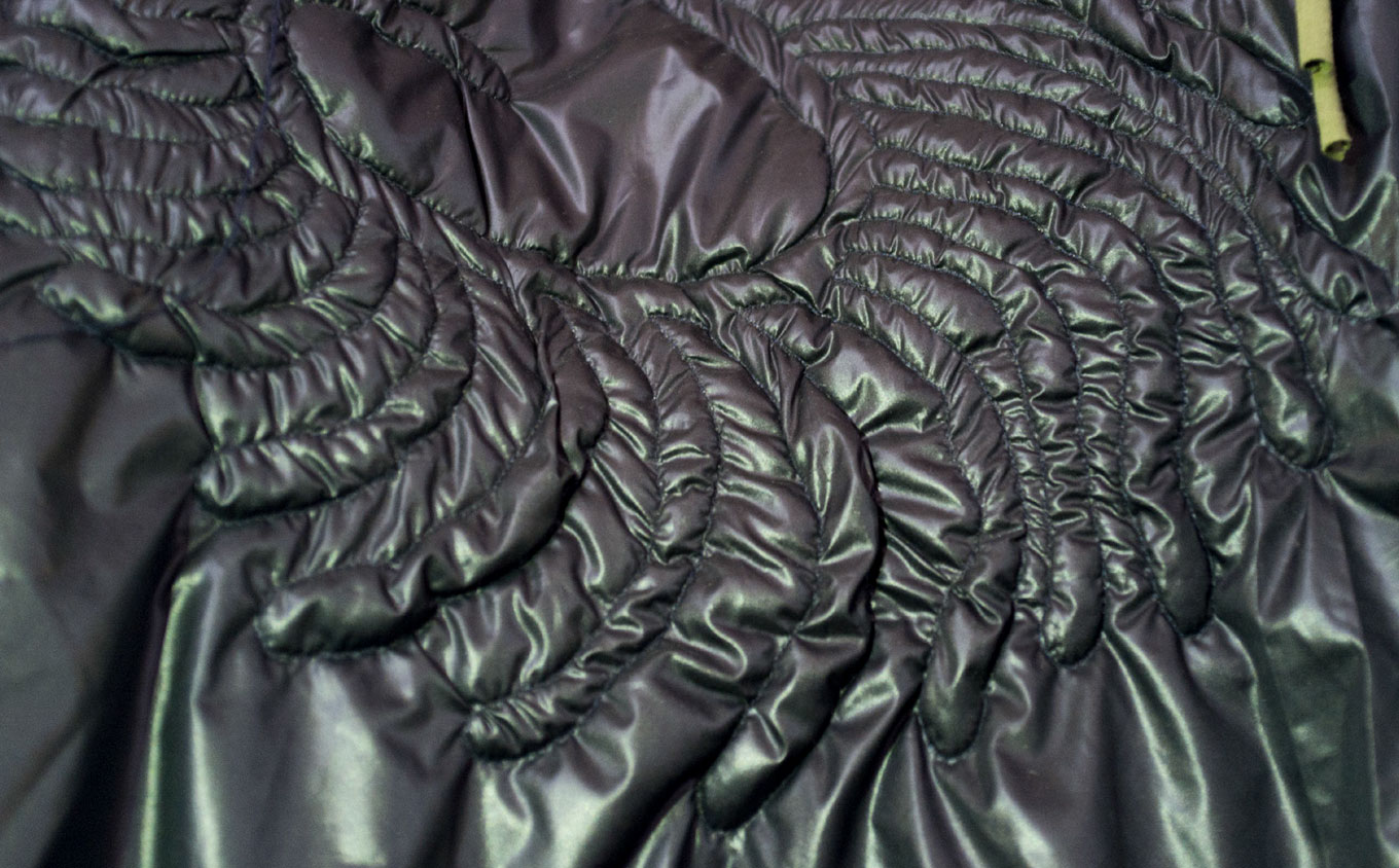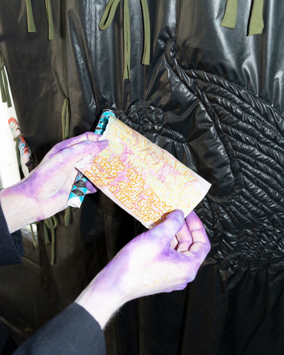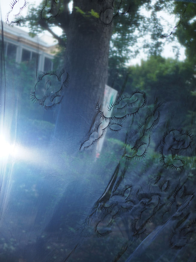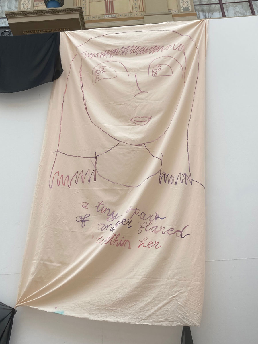 220 x 145 cm, acrylique sur tissu en coton, perles *larmes*, étiquette de t-shirt, poème sur un patron d’antenne, faux–cils