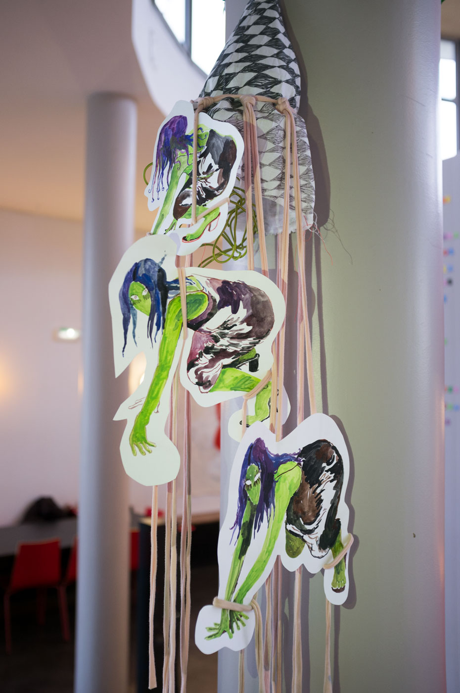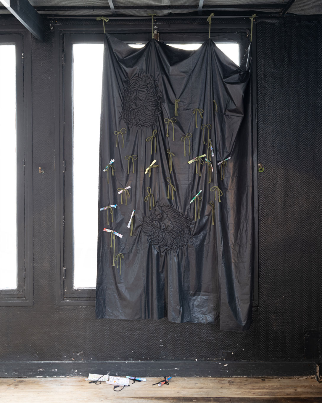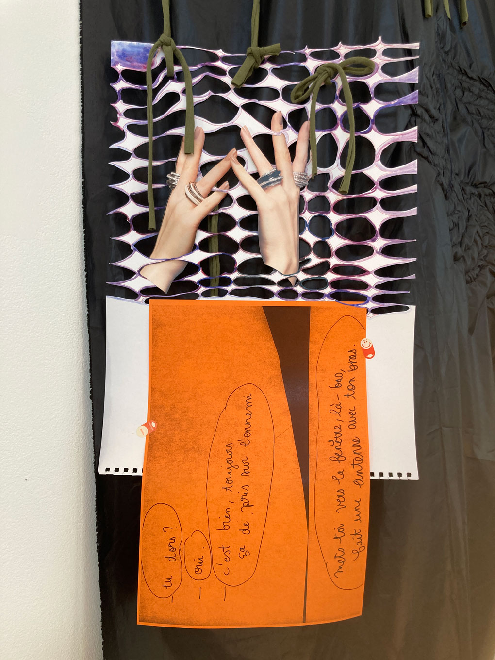 antennes brodées sur du polyester, noeuds en coton, mots et dessins sur papier