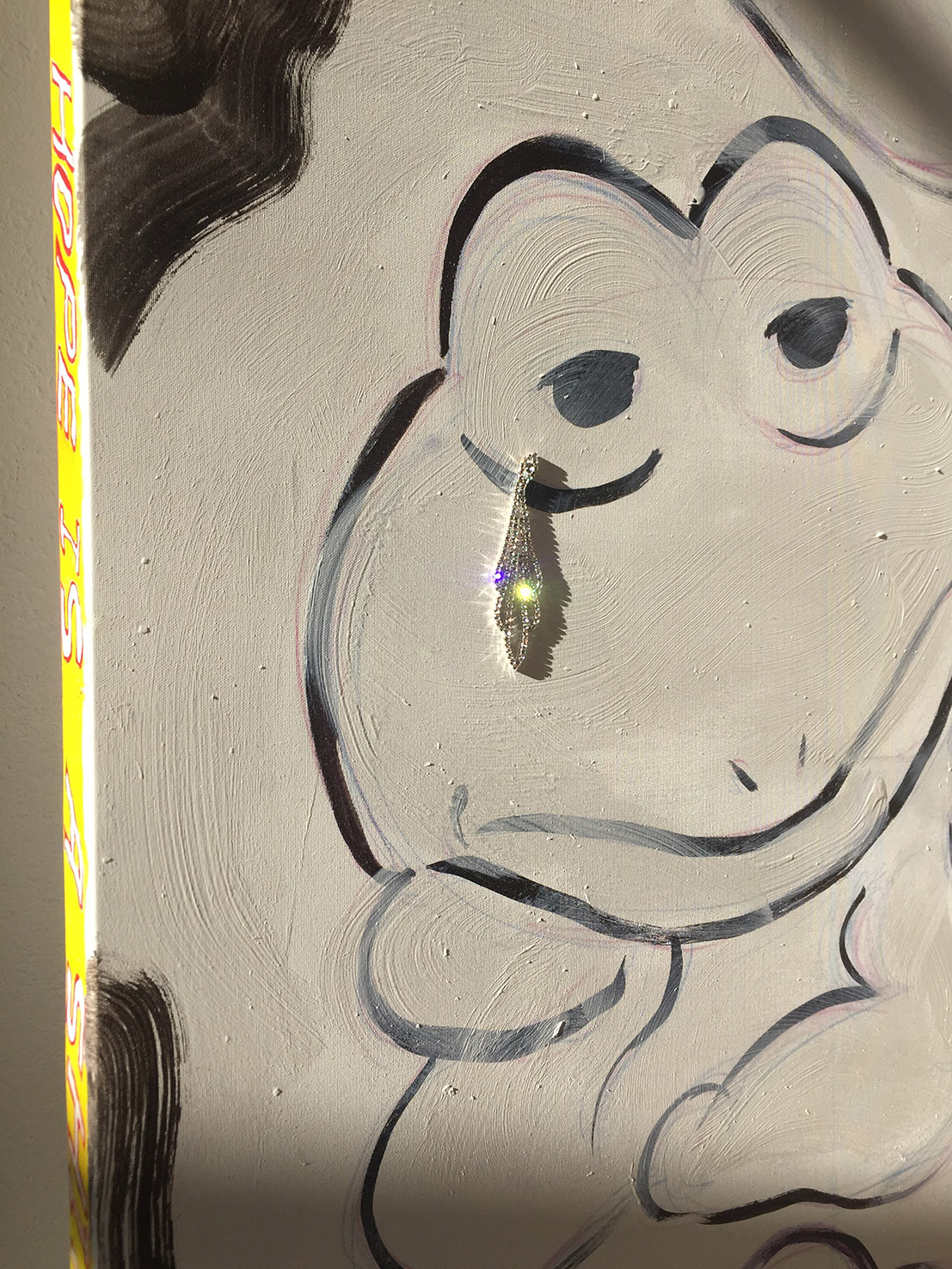 2020, acrylique sur toile, boucles d’oreilles faux diamants, fruits ou légumes de saison,